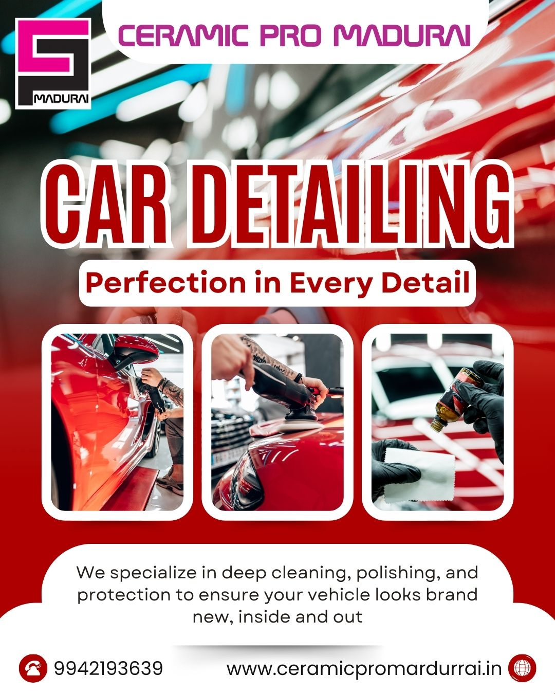 Elevate the allure of your vehicle with our premium car detailing services, designed to transform your ride into a masterpiece. Our expert team employs meticulous attention to detail, ensuring that every inch of your car shines like new. With a commitment to excellence, we understand that your vehicle is not just a mode of transportation; it is a reflection of your personality and style. Therefore, we utilize only the highest quality products and techniques to achieve a pristine finish that speaks volumes about your taste. Are you ready to experience the luxury of a truly detailed vehicle? Our comprehensive detailing packages cater to a variety of needs, whether you desire a thorough exterior wash, clay bar treatment, waxing, or an interior deep clean. Each service is tailored to enhance your car’s appearance and protect its surfaces from wear and tear. We pride ourselves on delivering results that not only meet but exceed your expectations. Booking an appointment with us is simple and convenient. Our user-friendly online system allows you to choose a time that fits your busy schedule. Once you arrive, our skilled technicians will assess your vehicle and recommend the best services to rejuvenate its appearance. From the moment you hand over your keys, you can trust that your car is in capable hands. We treat every vehicle with the utmost care, ensuring that it receives the attention it deserves. Our dedication to quality is matched by our passion for automotive elegance. We believe that every car has the potential to look stunning, and we are here to unlock that potential. Whether you drive a luxury sedan, a rugged SUV, or a classic car, our detailing services are designed to enhance every curve and contour. Don’t let dirt and grime diminish the beauty of your vehicle. Invest in our premium car detailing services today and rediscover the joy of driving a spotless car. Our commitment to customer satisfaction means we will work tirelessly to ensure you leave with a smile, proud of your vehicle’s revitalized appearance. Join our community of satisfied customers who have experienced the transformative power of our detailing services. Elevate your vehicle's allure and make a statement on the road. Book your appointment today and indulge in the luxury of a pristine finish. #CarDetailing #LuxuryService #AutomotiveElegance #CeramicProMadurai #VehicleCare #DetailingExcellence