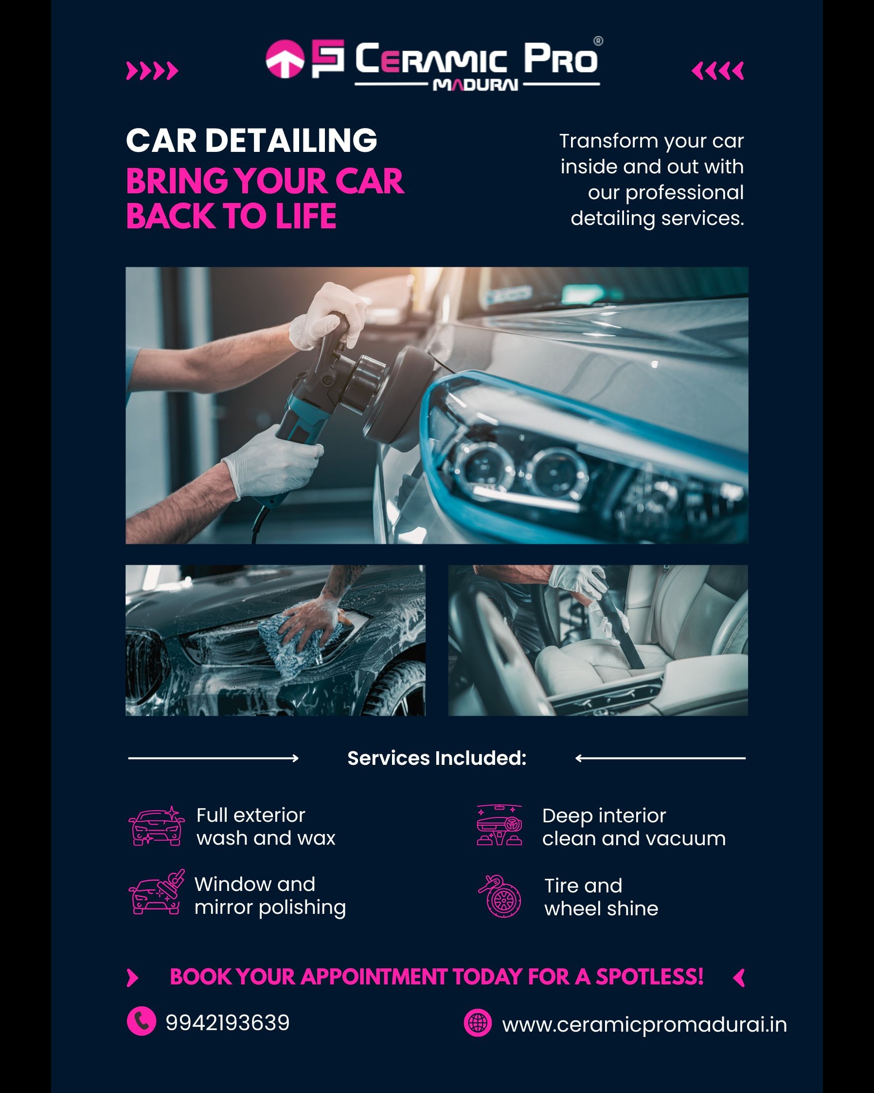 Our expert team uses premium products to restore shine and products to restore shine and protect your vehicle. From daily cars to luxury rides, we treat every vehicle with precision and care. Drive clean, drive confident with our trusted car detailing service. CONTACT: 9942193639 Website: www.ceramicpromadurai.in #cardetailing#autodetailing#carcare#carcleaning#carwash#detailinglife#shinycar#ceramiccoating#paintprotection#luxurycarcare#dindigulcarcare#thenicardetailing#sivagangaicarcare#virudhunagarcarcare#ramnadcardetailing#maduraidetailing#maduraibusiness#maduraicarcare#carpolish